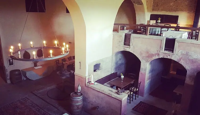 Verkostung von Weinen und typischen Gerichten in einem antiken Keller