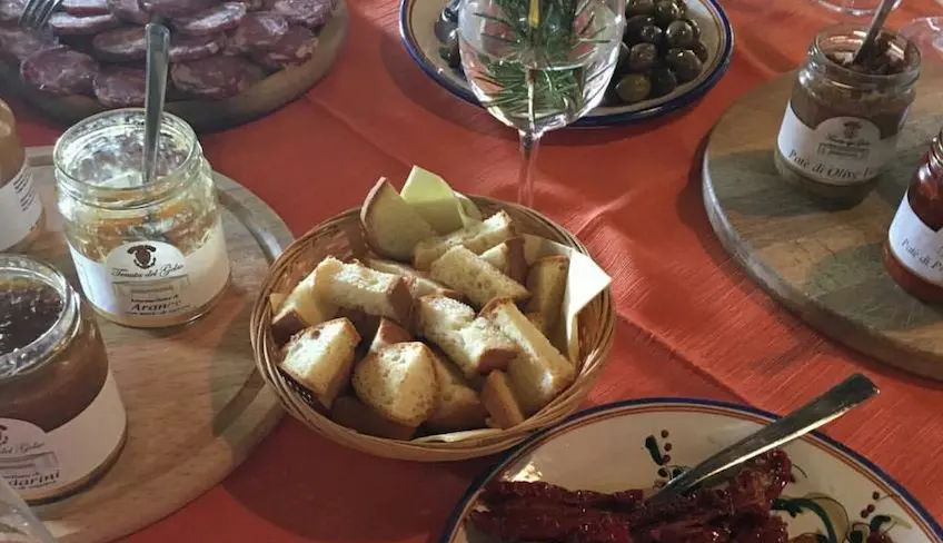 Verkostung: 3 Weine, in Öl eingelegte Produkte (schwarze Oliven, grüne Oliven, getrocknete Tomaten, Pilze), Salami di Brolo, 4 Käse, sizilianischer Brotaufstrich, Orangen- und Mandarinmarmelade, Pane cunzato, hausgemachte Bruschette, Mandarinen-Crunch. -