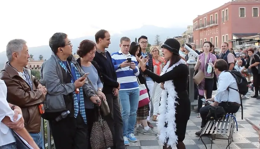 La vostra guida vi accompagnerà tra le strade, i monumenti e i palazzi di una località Siciliana arricchendo la vostra esperienza con l’incontro del “Genius Loci”, gli spiriti che abitano luoghi ricchi di storia, che prenderanno vita attraverso la narrazione di attori professionisti in costumi d’epoca e con gli antichi oggetti di scena. Sarete incuriositi dalla storia della famosa gestualità dei siciliani e imparerete anche voi questo linguaggio. Proverete a suonare il Marranzano, uno dei più antichi strumenti musicali al mondo, e ne ascolterete la caratteristica musicalità, incontrando personaggi famosi che hanno contribuito all’eredità culturale della Sicilia.