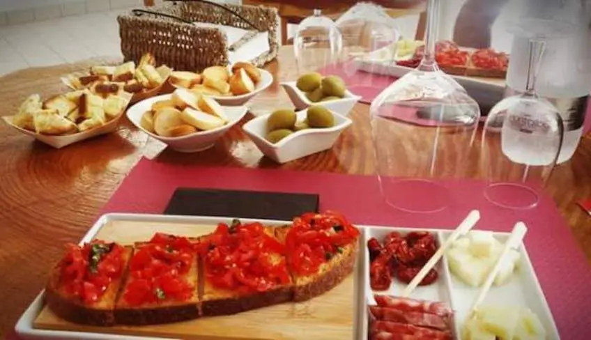 - Несколько типичных местных продуктов, таких как сыр, сушеные колбасы, оливки, сушеные помидоры, брускетта и хлеб, заправленные оливковым маслом.