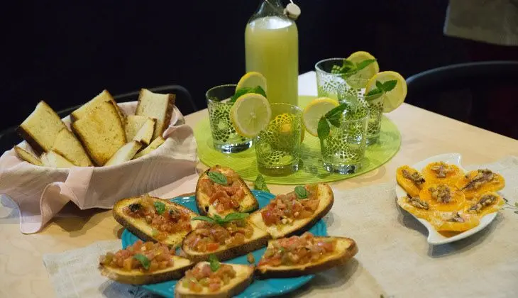 Программа включает в себя приготовление полного меню, то есть трех различных блюд сицилийской кухни: от капонаты из баклажанов до сделанных вручную кавателли с соусом из свежих помидоров, от пасты с сардинами до рулетиков из спатолы (местная рыба) с изюмом и кедровыми орешками, и, наконец, на десерт карамелизованный миндаль с корицей и какао.